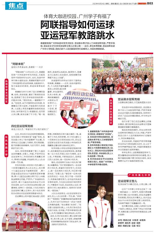 易建联现身广州市执信中学天河校区、亚运跳水男子双人三米板冠军何超、严思宇亮相、亚运会女子50米仰泳冠军汪雪儿分享心得……近日,多位体育明星、亚运冠军走进广州中小学校园,用自己的个人经历鼓励同学们迎