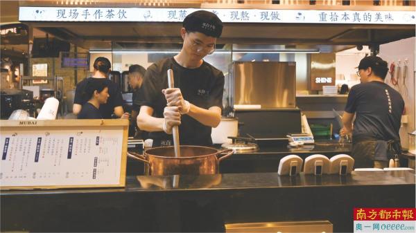 杭州来福士店,牧白手作的员工正在熬制烧仙草。将处理原材料及制作茶饮的过程透明地呈现给消费者,是手作奶茶最大的特点。 受访者供图