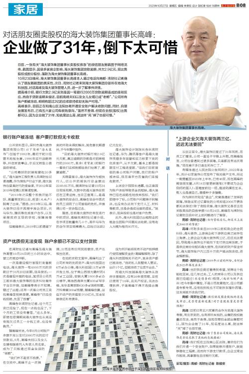 日前,一张有关“海大装饰集团董事长卖股权救急”的微信朋友圈截图于网络流传。截图显示,因受多家房企影响,海大装饰集团贷款逾期,共欠2.9亿元,现出售股权或部分股份,落款为海大装饰集团董事长高峰。