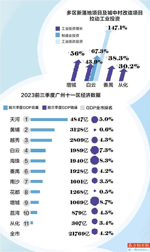 今年前三季度工业投资成为广州经济增长的拉动项,同比增长21.0%,而从各区的数据看,工业投资也是重要的增长“发动引擎”:在披露了该项数据的行政区中,增城工业投资同比增长56%,白云增长43.9%,番禺增长38.3%,从化增长30.2%。