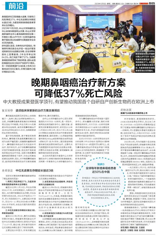 鼻咽癌研究又取得重大进展,可使死亡风险降低37%,中位无进展生存期延长接近3倍,为复发转移鼻咽癌患者带来长生存曙光。 2023年11月28日,中山大学肿瘤防治中心徐瑞华教授牵头开展,中山大学附属