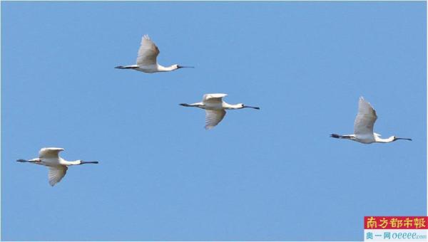 广州的观鸟爱好者曾在南沙湿地景区拍摄到20多只黑脸琵鹭飞翔的珍贵画面。