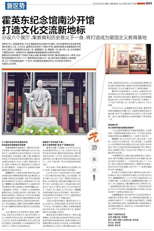 艺游未尽@南沙 拳拳赤子心,殷殷桑梓情。今年正值霍英东先生诞辰100周年,为纪念霍英东先生改革开放理念和奋斗人生,12月2日,霍英东纪念馆在广州南沙开馆。霍英东集团主席霍震霆在开馆仪式上表示,父