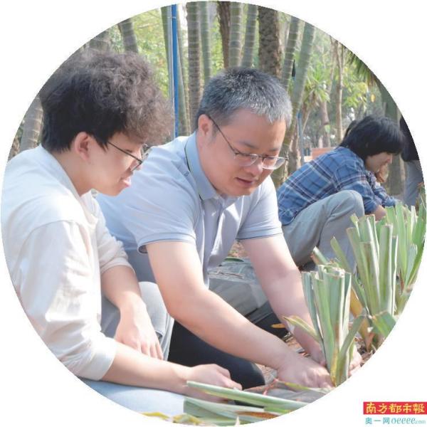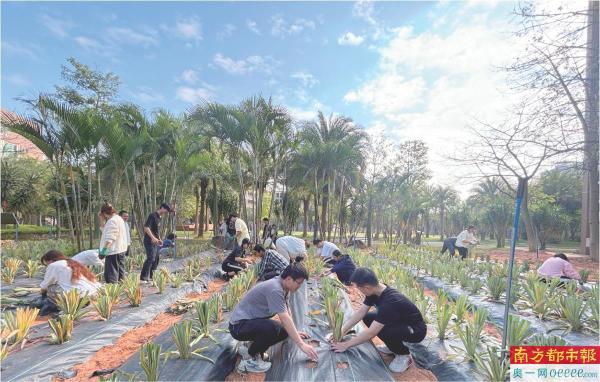 “菠萝的栽种深度一般在8cm左右,两株的间距控制在30—35cm之间,种好后脚踢苗立不倒,才算稳了……”在一大片碧绿散尾葵的掩映下,20多位学生蹲在覆盖着黑膜的田埂上忙碌,一手拿着菠萝苗,一手拿着铲刀,三三两两一组,彼此配合,完成菠萝栽培实践课。