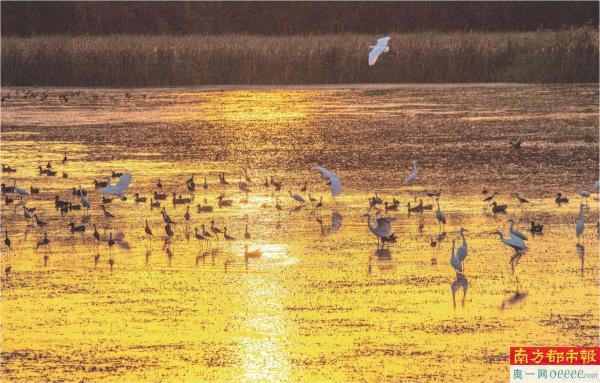 南沙湿地景区,过冬的候鸟,金色的夕阳,动人心魄的美。