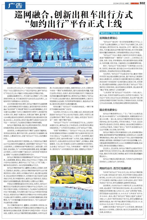 2023年12月12日上午,广州如约出行科技集团有限公司在广州白云国际会议中心广场召开发布会,宣布“如约出行”平台正式上线,并重点介绍其出租车巡网融合功能。 省道路运输事务中心、市交通行业主管部