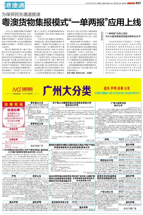 12月13日,粤澳货物集中申报模式“一单两报”应用首单申报成功。当日,首批内地出口供澳门鲜活商品通过采用集中申报模式“一单两报”应用经由拱北口岸顺利抵澳,这也标志着粤澳货物集中申报模式“一单两报”