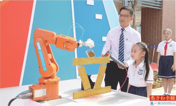 华南师范大学附属黄埔实验学校开学典礼,副校长肖宇宁与学生操作智能机械臂,书写“立”字。 南都记者 冯宙锋 摄(资料图)