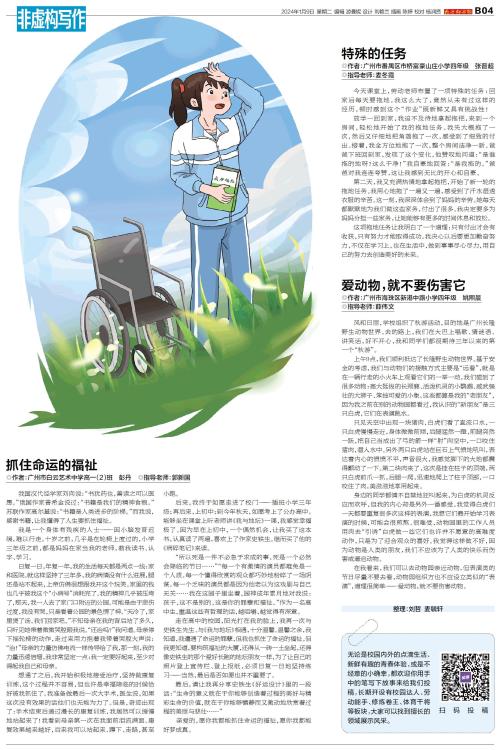 扫码投稿 风和日丽,学校组织了秋游活动,目的地是广州长隆野生动物世界。去的路上,我们在大巴上唱歌、猜谜语、讲笑话,好不开心,我和同学们都很期待三年以来的第一个“秋游”。