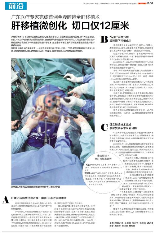 从传统手术40-50厘米的大切口到仅12厘米的小切口,实现术后3天即可进食,第4天恢复活动。日前,中山大学孙逸仙纪念医院副院长、器官捐献与移植管理中心学科带头人刘超教授带领该院肝移植团队成功完成了