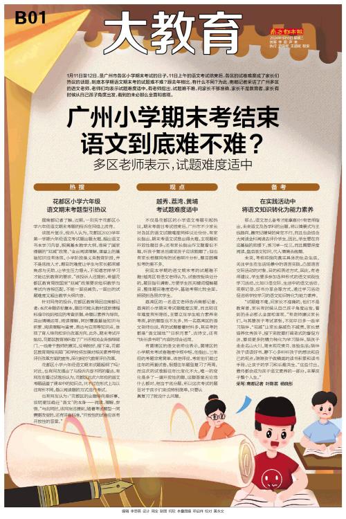 1月11日至12日,是广州市各区小学期末考试的日子。11日上午的语文考试结束后,各区的试卷难度成了家长们热议的话题,到底本学期语文期末考的试题难不难?跟去年相比,有什么不同?为此,南都记者采访了广