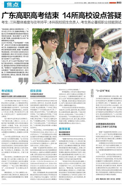“考试结束,请考生立即停笔作答……”1月14日上午10:30,随着铃声响起,广东省2024年普通高等学校招收中等职业学校毕业生统一考试(简称“3+证书”考试)落下帷幕,这也意味着2024年广东春季