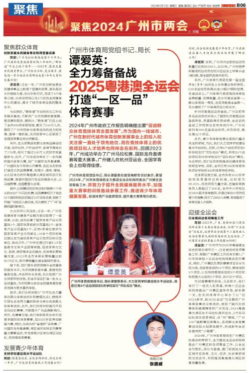 广州市体育局党组书记、局长谭爱英表示,大力支持学校建设高水平运动队,目前已有4个运动项目在6所学校实行“市队校办”模式。 南都记者张德威 2024年
