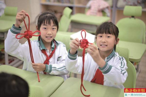 东风东路小学的孩子们在制作中国结、红灯笼。