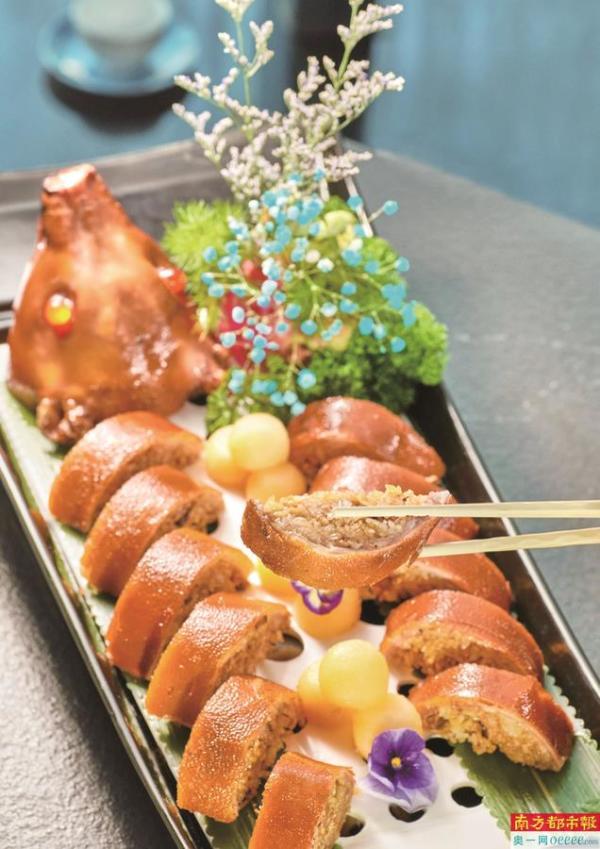 本次菜单,是由广州酒家的厨师团队提前两个月就开始着手策划。粤菜烹饪技艺非物质文化遗产代表性传承人、广州酒家集团出品总监蔡伟域介绍,今年广州酒家自主研制了大展宏图有米猪(炭烧脆皮有米猪),“有米”在粤语是有钱的意思,寓意全年大展宏图、财源广进。这道菜已成为很多客人新春期间的必点菜,由于烹饪工艺复杂需要提前预订。