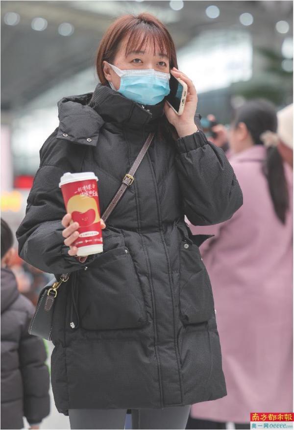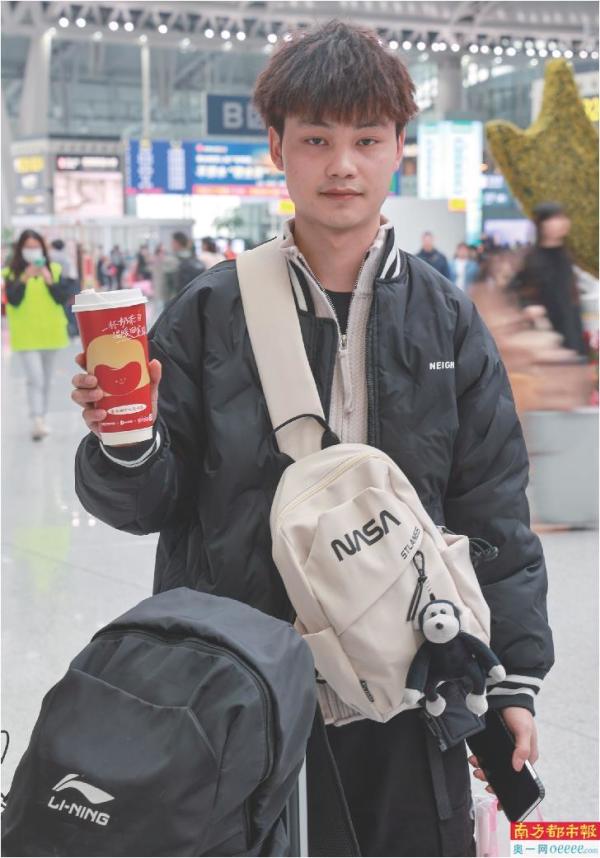 广州南站,旅客喝上热乎乎的联名奶茶。