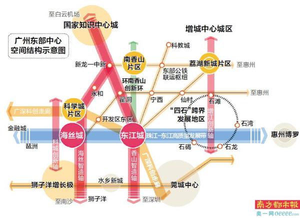 广州依托黄埔产业基础扎实和增城空间广阔的比较优势,以及“三客一货”的铁路枢纽集群和两个国家级开发区的良好基础,将黄埔与增城两区约896平方公里的连接区域,规划成为广州东部中心,谋划综合门户枢纽能级提升,聚力建设广州“三脉”“三轴”“三核”战略部署下的“现代活力核”。