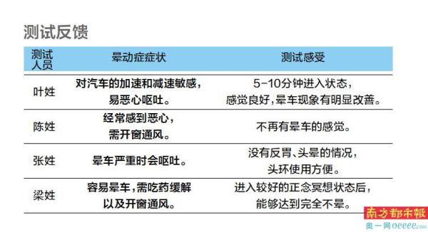 南都记者采访了4位测试人员。叶姓测试人员主要对汽车的加速减速敏感,乘坐汽车时表现出恶心想吐的现象。他参加了5次测试。“需要5-10分钟进入状态,此后感觉良好,晕车现象有明显改善。”他说道。