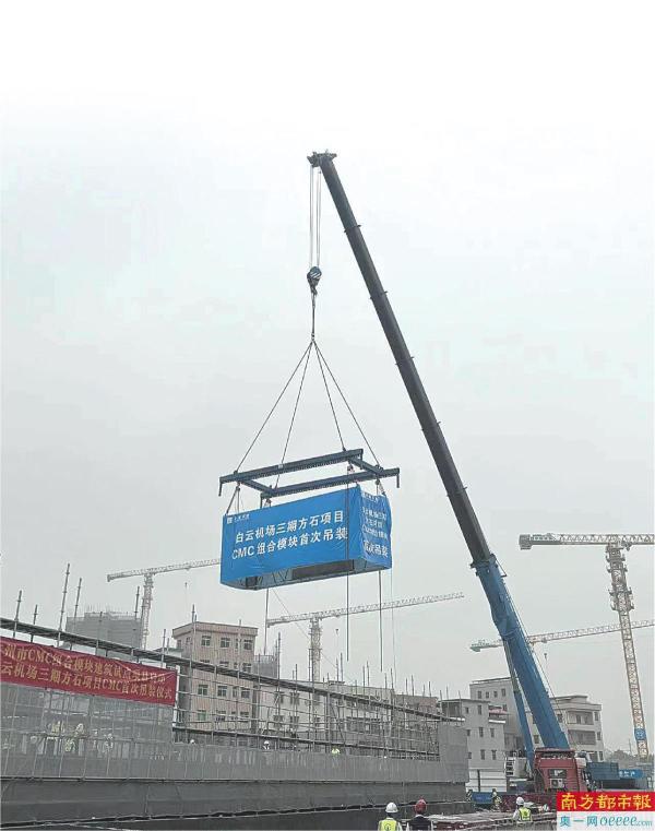 白云机场三期扩建工程安置区项目的装配式建筑吊装现场。