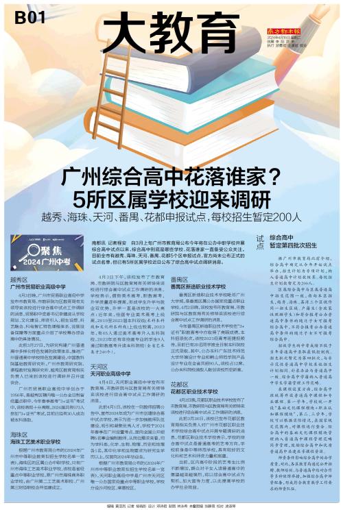 南都讯 记者程安 自3月上旬广州市教育局公布今年将在公办中职学校开展综合高中试点以来,综合高中到底是哪些学校、花落谁家一直备受公众关注。目前全市有越秀、海珠、天河、番禺、花都5个区申报试点,官方尚