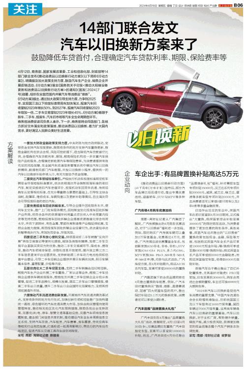 4月12日,商务部、国家发展改革委、工业和信息化部、财政部等14部门联合发布《推动消费品以旧换新行动方案》(以下简称《行动方案》),明确提及加大政策支持力度,鼓励汽车生产企业、销售企业