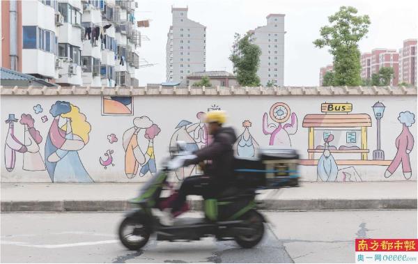 2023年10月9日,一名男子驾驶电动自行车从街头一处艺术涂鸦墙前经过。 新华社发