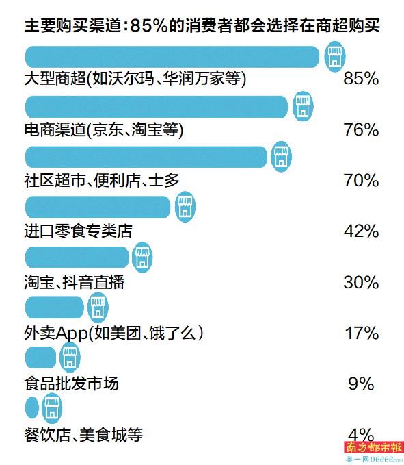 根据赛立信2023年休闲零食消费研究报告,消费者购买休闲零食主要是为了“充饥”,其次是解馋和休闲娱乐;在购买休闲零食时,有53%的消费者会关注配料表和营养成分。在购买渠道方面,大型商场、电商渠道、超市便利店等渠道占据了接近70%的比例,高达85%的消费者选择在大型商超购买。