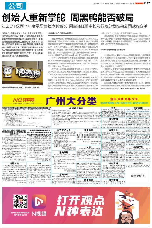 6月12日,周黑鸭发布公告称,因个人发展原因,张宇晨已经辞任执行董事、行政总裁以及董事会策略发展委员会委员职务,周黑鸭创始人、董事长周富裕已经被委任为行政总裁,周黑鸭称,目前公司正处于重要的战略变
