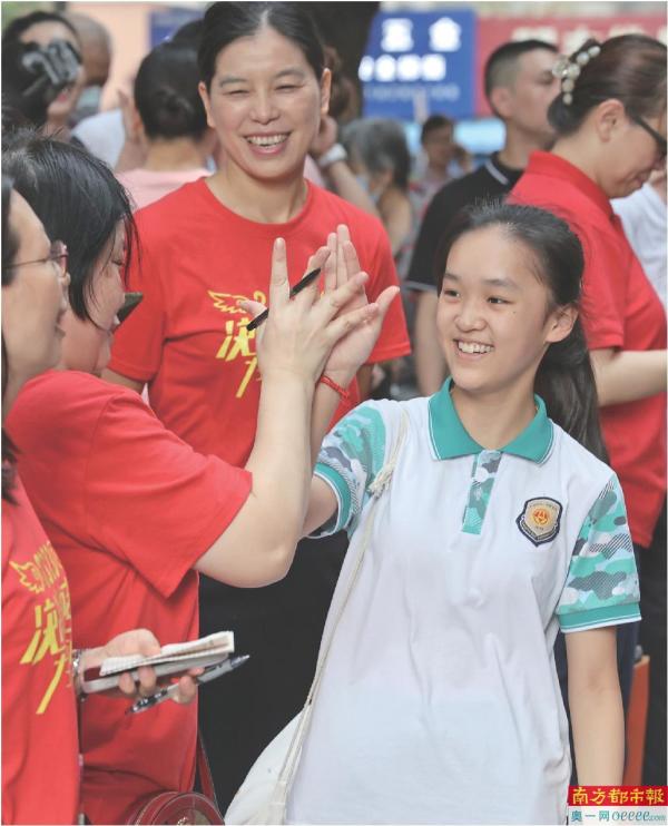 广州市铁一中学考点,老师家长给考生加油。 南都记者 冯宙锋 摄 (资料图)