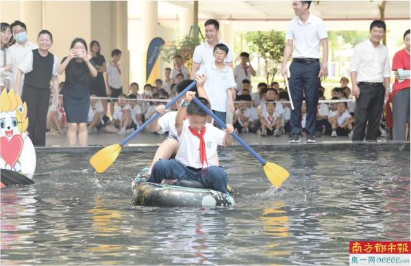 其中,“制作班船”要求全班师生合作制作一艘船,船上坐一个人,从好奇湖一头划到另一头。在展示日,各种造型、各种动力、各种材料的班船齐上阵,各领风骚。一艘艘班船,承载着孩子们的创意、合作和动手能力,漂到终点。