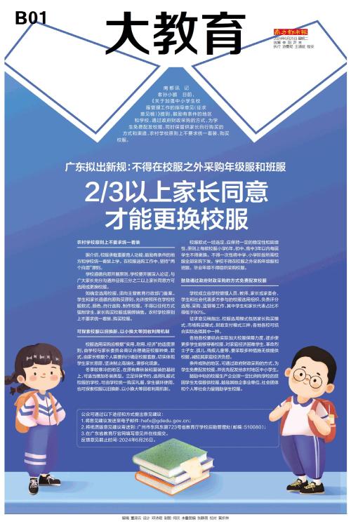 南都讯 记者孙小鹏 日前,《关于加强中小学生校服管理工作的指导意见(征求意见稿)》提到,鼓励有条件的地区和学校,通过政府财政采购的方式,为学生免费配发校服,同时保留供家长自行购买的方式和渠道,农村