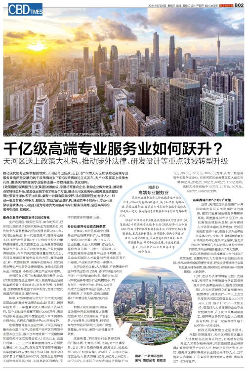 推动现代服务业集群提质增效,天河区再出新政。近日,《广州市天河区加快推动高端专业服务业高质量发展的若干政策措施》(下称《政策措施》)正式发布,为产业发展送上政策大礼包,推动天河区高端专业服务业进一