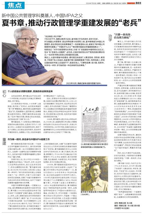 “无法相信,何以平静!” 7月24日下午,南都记者多方证实,夏书章已于当天逝世,享年105岁。 作为我国公共管理学、政治学界的泰斗和领军人物,夏书章教授为中国公共管理学、政治学的创立和发展奉献