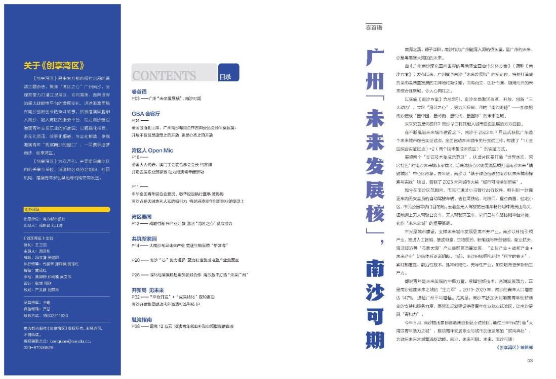 《创享湾区》是由南方都市报社出品的高端主题杂志,聚焦“湾区之心”广州南沙,呈现其奋力打造立足湾区、协同港澳、面向世界的重大战略性平台的发展变化,讲述港澳同胞在南沙创新创业的奋斗故事,拓展港澳同胞融