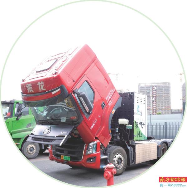 在纵贯广州市白云区的白云大道上,一辆半挂卡车驶过。与常见的半挂卡车不同,这辆半挂卡车不仅没有柴油大卡车的噪音和废气,驾驶室背后的“大方盒”更是直观展现了它的身份——氢能源商用车。