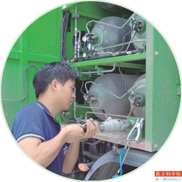 工作人员将充气枪与氢能源渣土车的气瓶入口处相连接后,启动充气,不到15分钟,渣土车的气瓶已加满。