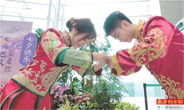 8月6日,6对新人身着传统婚庆服饰在白云机场举行婚礼仪式。受访者供图
