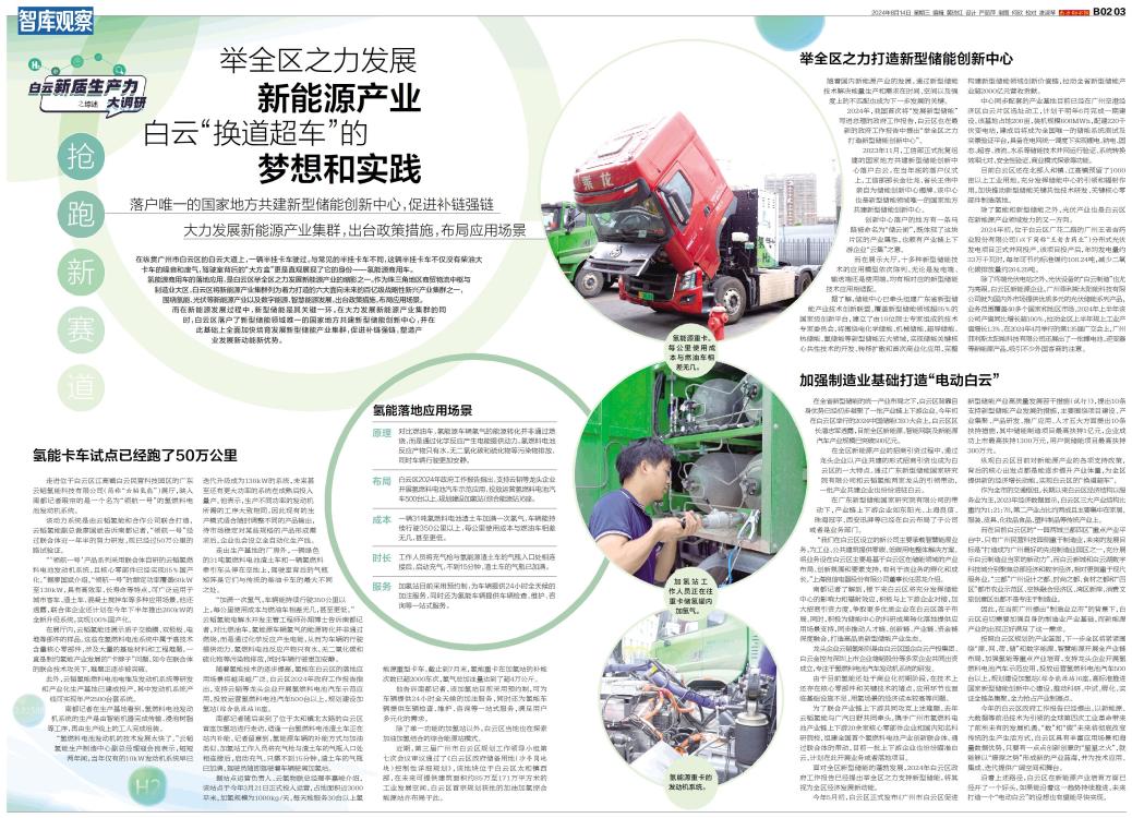 综述 抢跑新赛道 落户唯一的国家地方共建新型储能创新中心,促进补链强链 大力发展新能源产业集群,出台政策措施,布局应用场景 在纵贯广州市白云区的白云大道上,一辆半挂卡车驶过。与常见的半挂卡
