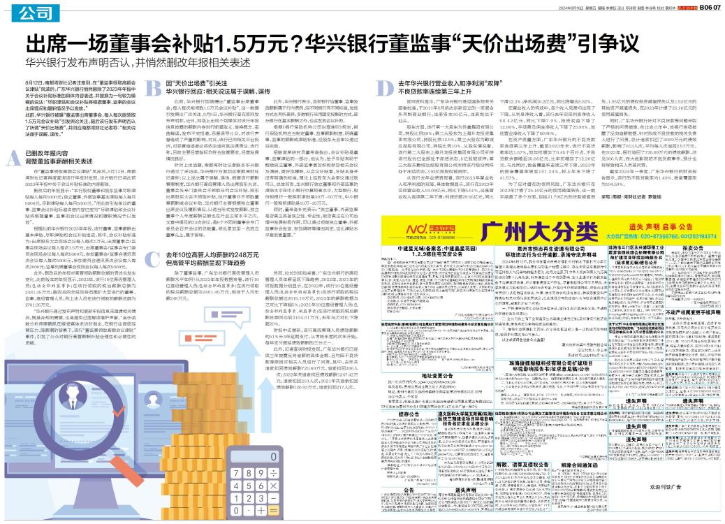 8月12日,南都湾财社记者注意到,在“董监事领取高额会议津贴”风波后,广东华兴银行悄然删除了2023年年报中关于会议补贴标准的具体内容表述,并替换为一句较为模糊的说法:“尽职津贴和会议补贴将根据董