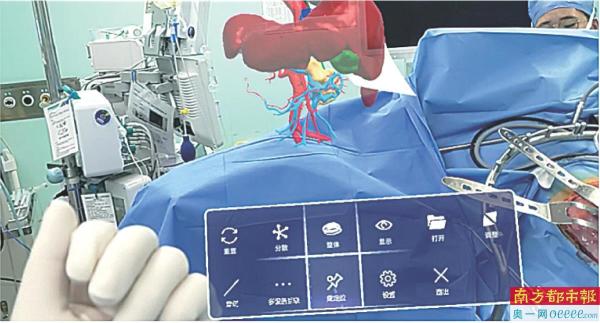 “利用增强现实的光学设备,我们能清晰地看到一个三维立体的‘病变器官’。通过虚拟键盘的指端操作,这个‘器官’可以放大缩小旋转,以全息镜像的形式呈现在手术室虚空环境中,不仅便于手术医生深入到器官中熟悉其解剖结构,确定肿瘤边界;还可以设计出一套既能精准、完整切除肿瘤组织,又能保护核心血管、神经的手术方案”。