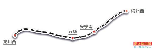 位于广东东部的梅龙高铁正线全长93.982千米,设计行车速度350公里/小时,途经梅州市、河源市等城市,全线设梅州西、兴宁南、五华、龙川西4个车站,其中兴宁南、五华为新建车站,其余为既有车站。