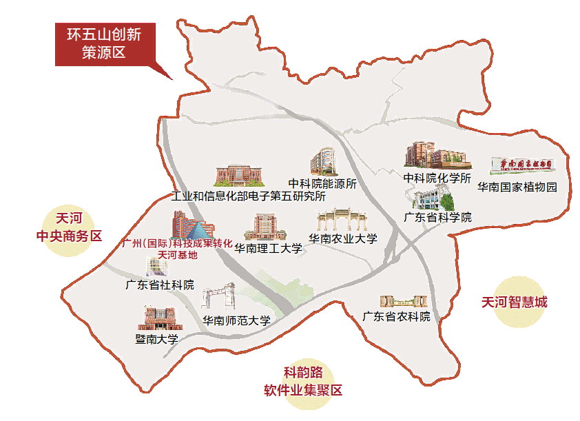2022年,广州首次提出“环五山创新策源区”的概念,并将其与琶洲、环港科大(广州)、环大学城并列为四大科创区。
