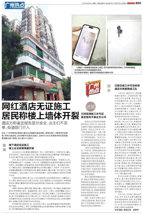 近日,广州市海珠区碧海大厦业主向南都记者反映称,碧海大厦1-4楼突然开始装修。然而大家发现,此次装修不仅是无证施工,还有不少业主在装修开始后发现家里墙壁出现了裂缝,这让他们十分担心。 现场 楼