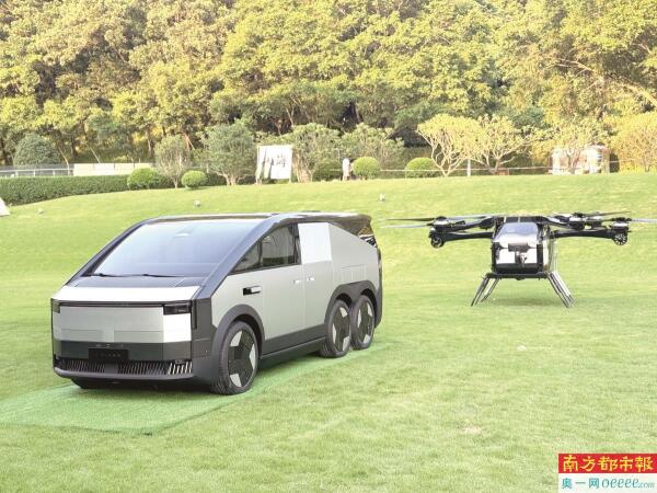 广州黄埔国际会议中心外,一架6翼飞行器垂直升空。在其后方的草坪上,停放着一台六个轮子的“庞然巨物”,外形极简凌厉,犹如游戏中的赛博机甲。两大机械体共同组成小鹏汇天的“陆地航母”,这是其首次公开亮相。9月3日,小鹏汇天“陆地航母”飞行汽车超前品鉴会在广州黄埔举行。
