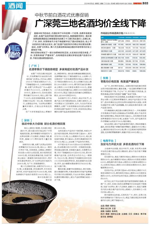 随着中秋节的临近,白酒迎来下半年的第一个旺季,消费市场逐渐活跃,名酒产品的终端价格也格外受关注。根据南都湾财社-酒水新消费指数课题组记者整理发布的第三十三期《湾区酒价》,近期以来,广州、深圳、东莞