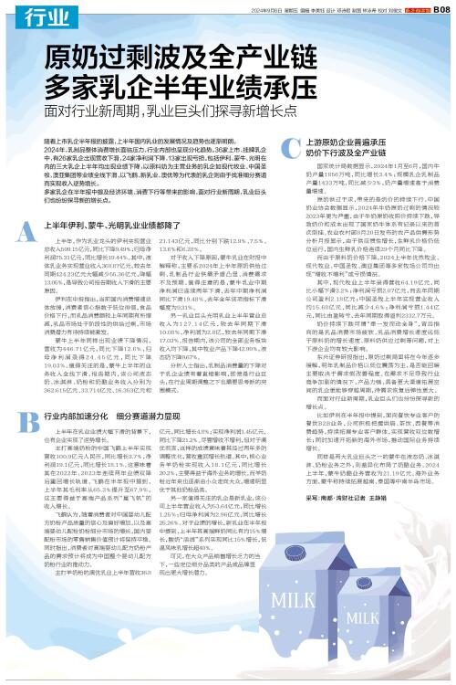 原奶过剩波及全产业链 多家乳企半年业绩承压