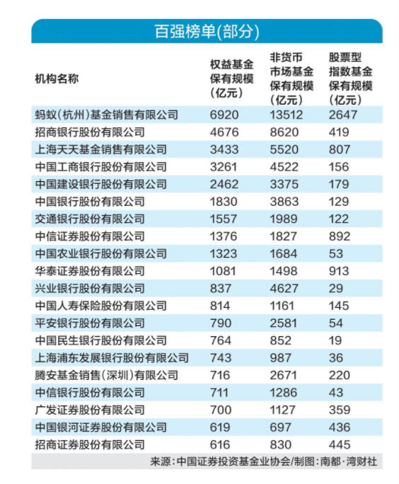 在权益基金保有规模方面,上述三家机构依然排在前三位,蚂蚁基金、招商银行和天天基金的保有规模分别为6920亿元、4676亿元和3433亿元。