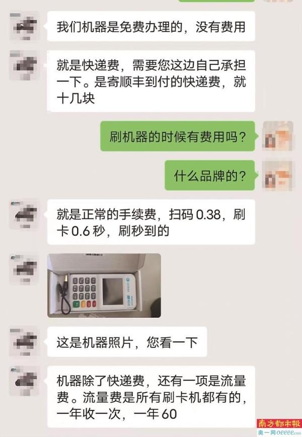 杨女士与代理商的聊天截图。通过代理商,她免费办理了POS机。