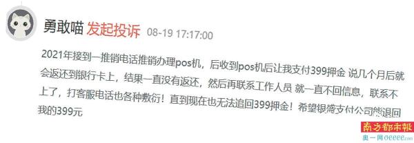 9月13日,南都湾财社记者在黑猫投诉平台上以“银盛支付”为关键词进行搜索,发现有33187条相关投诉,涉及问题主要集中在POS机私调费率、不退押金等问题上。从投诉内容来看,涉及的推销POS机的业务员,大多以办理信用卡、免费办理POS机、退还押金或是低费率等为噱头,诱导商户办理POS机。然而,在实际使用过程中,商户往往会发现存在高额押金、刷卡不到账、费率变相上涨等问题。