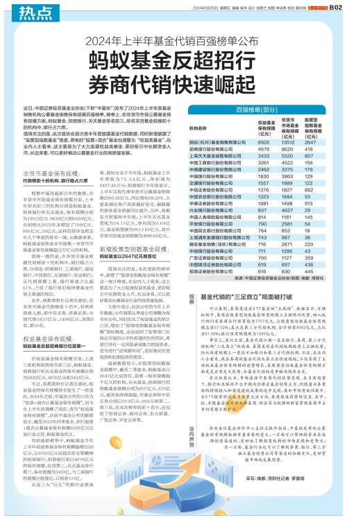 近日,中国证券投资基金业协会(下称“中基协”)发布了2024年上半年度基金销售机构公募基金销售保有规模百强榜单。榜单上,在非货币市场公募基金保有规模方面,蚂蚁基金、招商银行、天天基金排